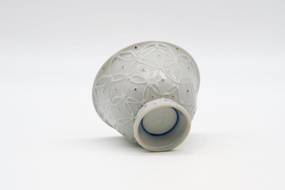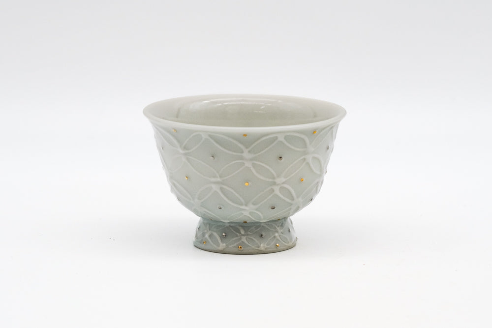 Takashima ShinichiThis delicate and elegant Kiyomizu-yaki porcelain senchawan (sencha cup) is hand-decorated with the auspicious shippo (七宝) crest using the icchin (イッチン) technique. Icchin involves loading slip (liquid clay) into a piping bag, and trailing it onto the pot to create designs with dimension. On this piece, each shippo-mon is further accented by alternating dots of silver and gold at their centre.
