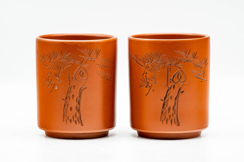 Japanese Teacups - Pair of Engraved Red Shudei Tokoname-yaki Yunomi - 150ml