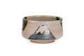 Katō Hiroshige (Kasen Kiln)This hand-crafted Oribe chawan (matcha bowl) features hand-painted playful iron underglaze drawing of Mt. Fuji, accented with splashes of the signature copper green glaze of Oribe wares.