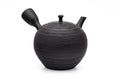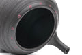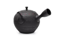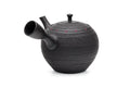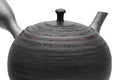 Hokuryū (Tatsuo Umehara)This expertly crafted Tokoname-yaki kyusu (teapot) is thrown from Tokoname kokudei (黒泥) clay, which has the same properties as the iconic red shudei (朱泥) but is fired in reduction producing a deep black. The body is decorated with a detailed pine bark textured that contrasts with the smooth spout and handle. Made using a small wheel, this texturing technique is called matsugawa (松皮 - pine bark) in Japanese. The rim of the kyusu is also decorated with small pink circles.