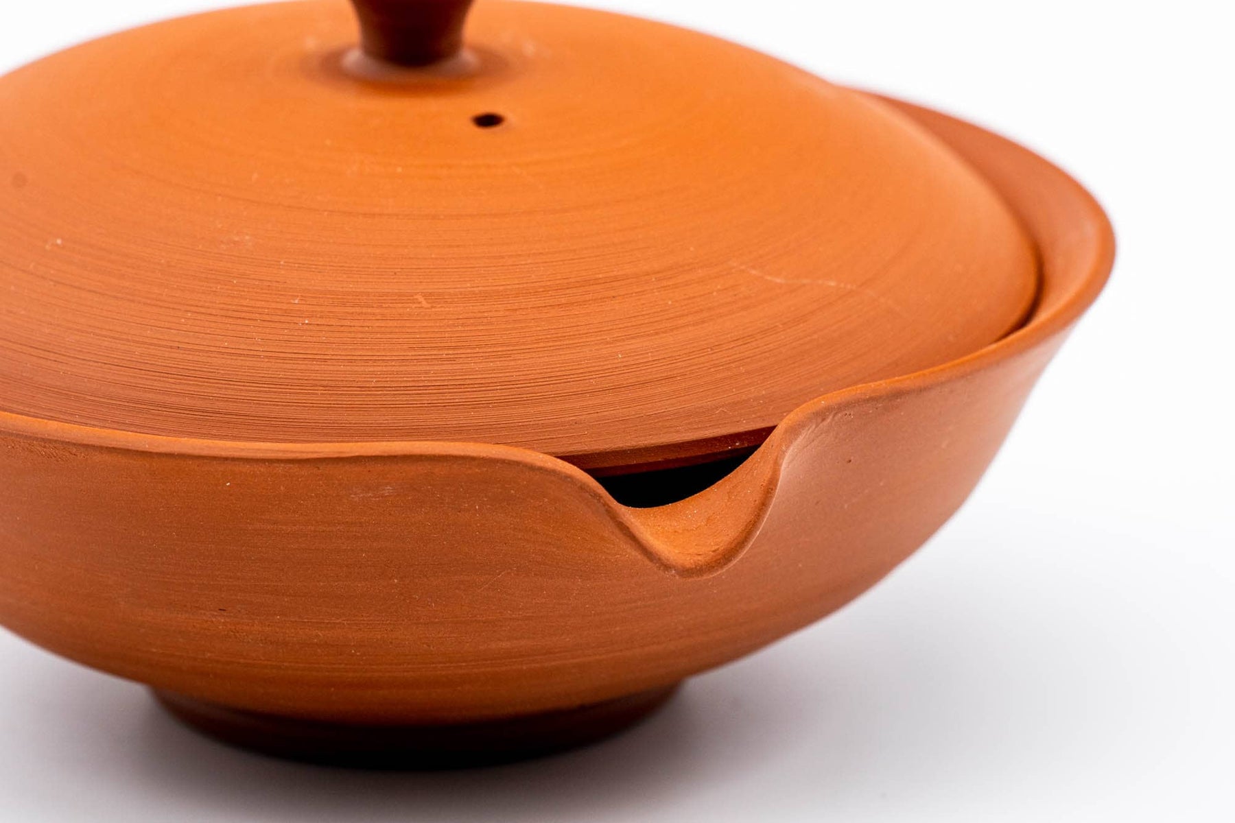 In Japanese, 絞り出し急須 (shiboridashi kyuusu) roughly translates to "squeeze-pour teapot", as the design of the teapot allows you to squeeze every last drop of the liquor from the leaves. Similar in construction to a chinese gaiwan, shiboridashi are the simplest type of Japanese teapot, consisting of only a spouted bowl and a lid. Despite this simplicity, shiboridashi are very difficult to make well. Unlike kyusu and houhin, shiboridashi have no filter, instead using the narrow gap between the lid and the body to separate the liquor from the leaves. Additionally, most shiboridashi also have fine grooves carved into the bowl at the spout which helps keep the leaves from being poured out. On most shiboridashi, the lid rests on a lip just like with kyusu and houhin. This means that the gap at the spout remains at a fixed size. However, many high-end, handmade shiboridashi such as this one have no such lip, allowing this gap to be adjusted.