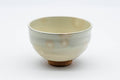 This Mino-yaki chawan (matcha bowl) has a classic wan-nari shape with a subtle spiral effect called rokurome (ろくろ目 - pottery wheel marks) made by the potter's fingers as they slide up the cup, shaping it on the pottery wheel. It is a glazed in an off-white, kohiki-style glaze, with subtle pink spots in a glaze effect known as gohonte (御本手). Made by Maruyoshi (丸義).