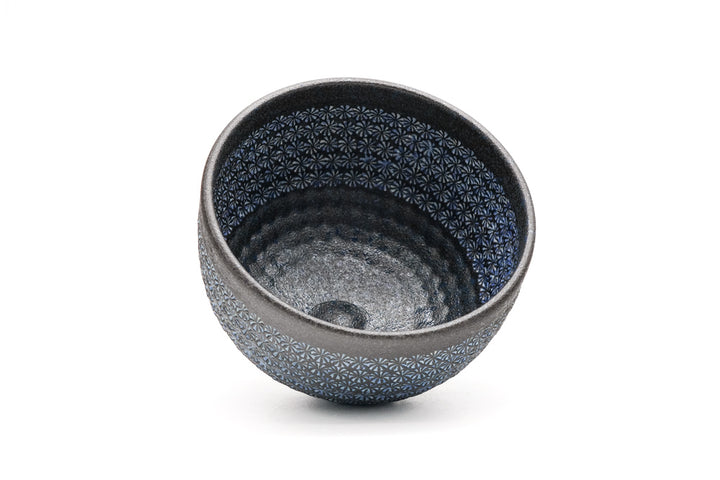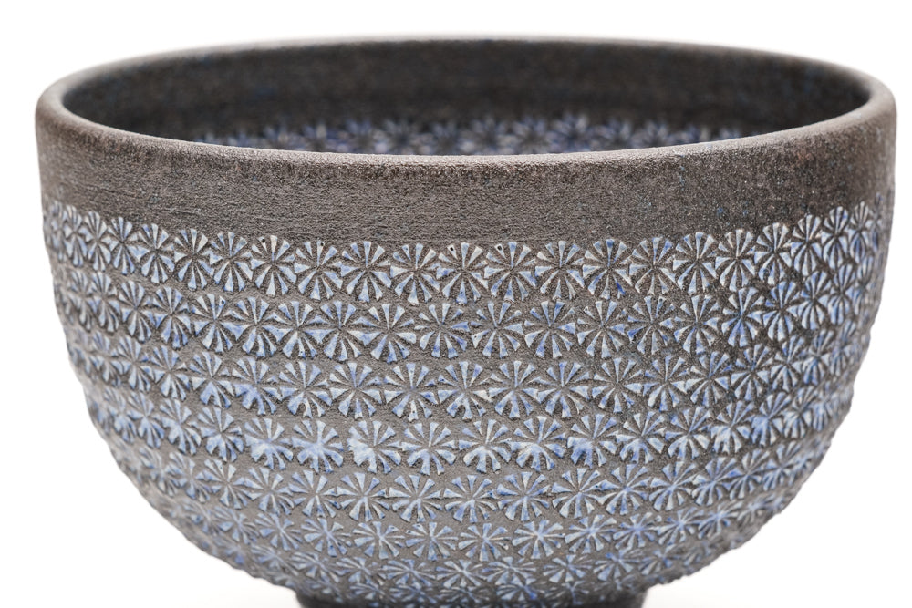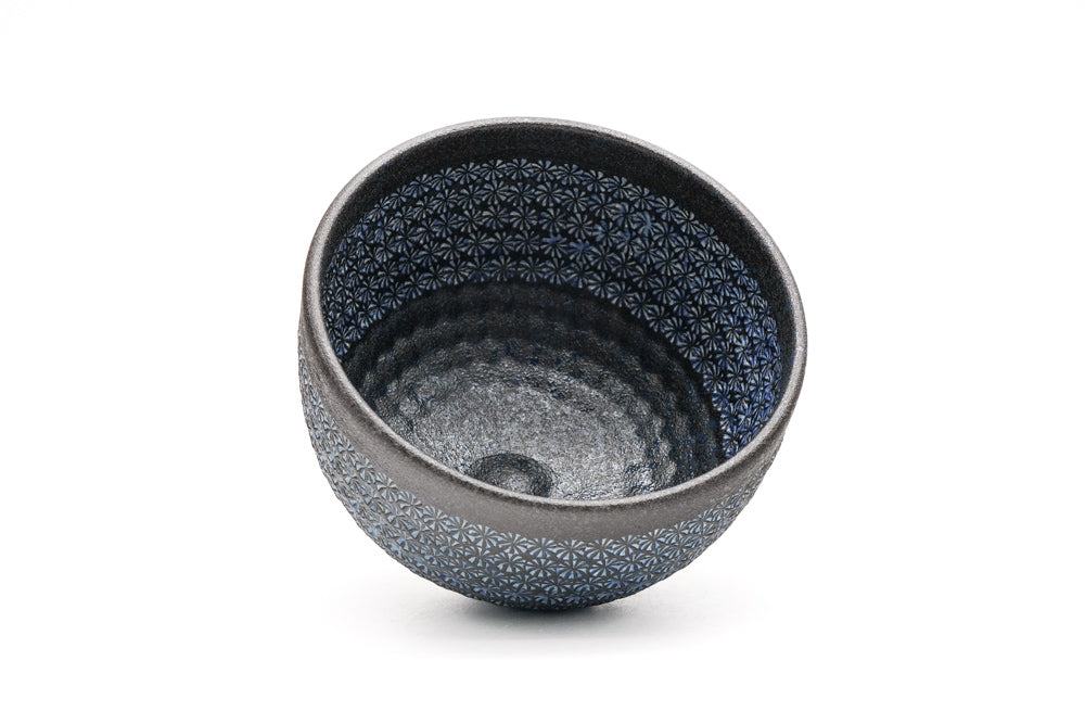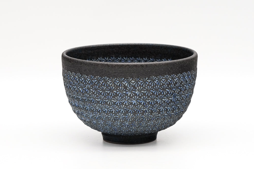 This Kiyomizu-yaki chawan (matcha bowl) has a classic wan-nari shape and is decorated in a unique style called ao-mishima (青三島). In contrast to the traditional mishima style which employs white slip to highlight stamped designs, here a stylish blue is used instead to fill in the stamped flowers. The base glaze underneath is a textured matte black.