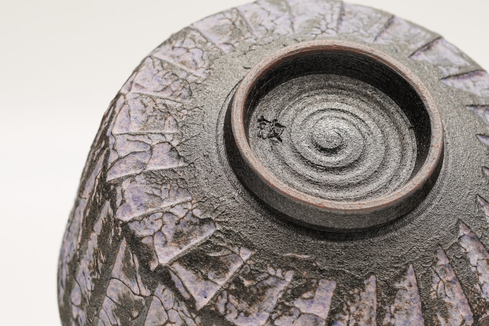 Igura ToshiyaThis Kiyomizu-yaki chawan (matcha bowl) is made in the classic hantsutsu-gata shape and is decorated in the classic sogimon (そぎ紋) style. Sogi, also called sogime or sogimon is a traditional ceramic decoration style of vertical fluting. On this chawan, the fluting design is widely spaced, giving a faceted impression. Atop a base glaze of textured matte black, this bowl sports patches of vibrant purple.
