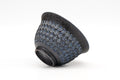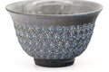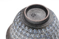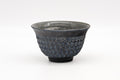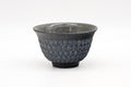 Igura ToshiyaThis Kiyomizu-yaki yunomi (teacup) has a classic flared tulip shape and is decorated in a unique style called ao-mishima (青三島). In contrast to the traditional mishima style which employs white slip to highlight stamped designs, here a stylish blue is used instead to fill in the stamped flowers. The base glaze underneath is a textured matte black. The inside of the cup is glazed in a smooth grey and decorated with a single hakeme (刷毛目 - brush stroke)