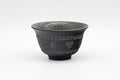 Igura ToshiyaThis Kiyomizu-yaki yunomi (teacup) has a classic flared tulip shape and is decorated in a unique style called ao-mishima (青三島). In contrast to the traditional mishima style which employs white slip to highlight stamped designs, here a stylish blue is used instead to fill in the stamped flowers. Additionally, this cup has a belt of yellow and pink flowers. The base glaze underneath is a textured matte black. The inside of the cup is glazed in a smooth grey and decorated with a single hakeme (刷毛目 - brush stroke)