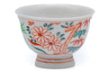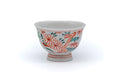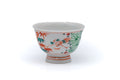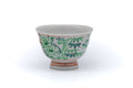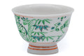 This delicate and elegant Kiyomizu-yaki porcelain sencha wan (sencha cup) is hand-painted in a style called sai-akaaoe (彩赤青絵), a combination of red and green overglaze painting. This cup features designs of bamboo, flowers, and birds.