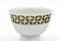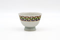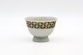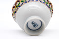 Kuramoto MasaoThis delicate and elegant Kiyomizu-yaki porcelain senchawan (sencha cup) is decorated with shippo (七宝) crests along the rim that are hand-painted in blue, green, and red with gold accents