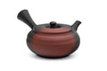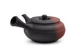 This exquisitely crafted Tokoname-yaki kyusu (teapot) has a unique shape and is made from the iconic Tokoname shudei (朱泥) clay, known for its brilliant red colour and ability to subtly reduce the astringency of tea. This pot has a striking yōhen (窯変) gradient from a rich red to a deep black, created by a second reduction firing in which the pot is half covered in rice husks.