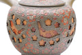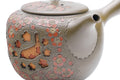 Made by Mano Shunen (間野舜園). Born in 1950, Shunen-san is the second generation to use the Shunen name and has become famous for his incredibly intricate, multi-layered carved kyusu, which take the traditional art of carved teapots to the next level. Unlike the traditional method, in which the potter and the engraver/carver are two seperate artists, Shunen's unique vision and attention to detail means he crafts the entire piece himself, from making the clay, to throwing the pot, assembling the pieces, and carving the designs. Another unique aspect of his kyusu are the downturned spouts which Shunen designed to improve the pouring experience.