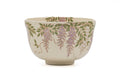 Miyaji EikōThis Kyo-yaki chawan (matcha bowl) is decorated with elegant purple and white wisteria (藤 - fuji) draped over a crazed beige-ivory glaze. The bowl is made in the classic Ninsei (仁清) shape, with a slight waist or tightening of the torso, accompanied with a slightly inward facing lip.