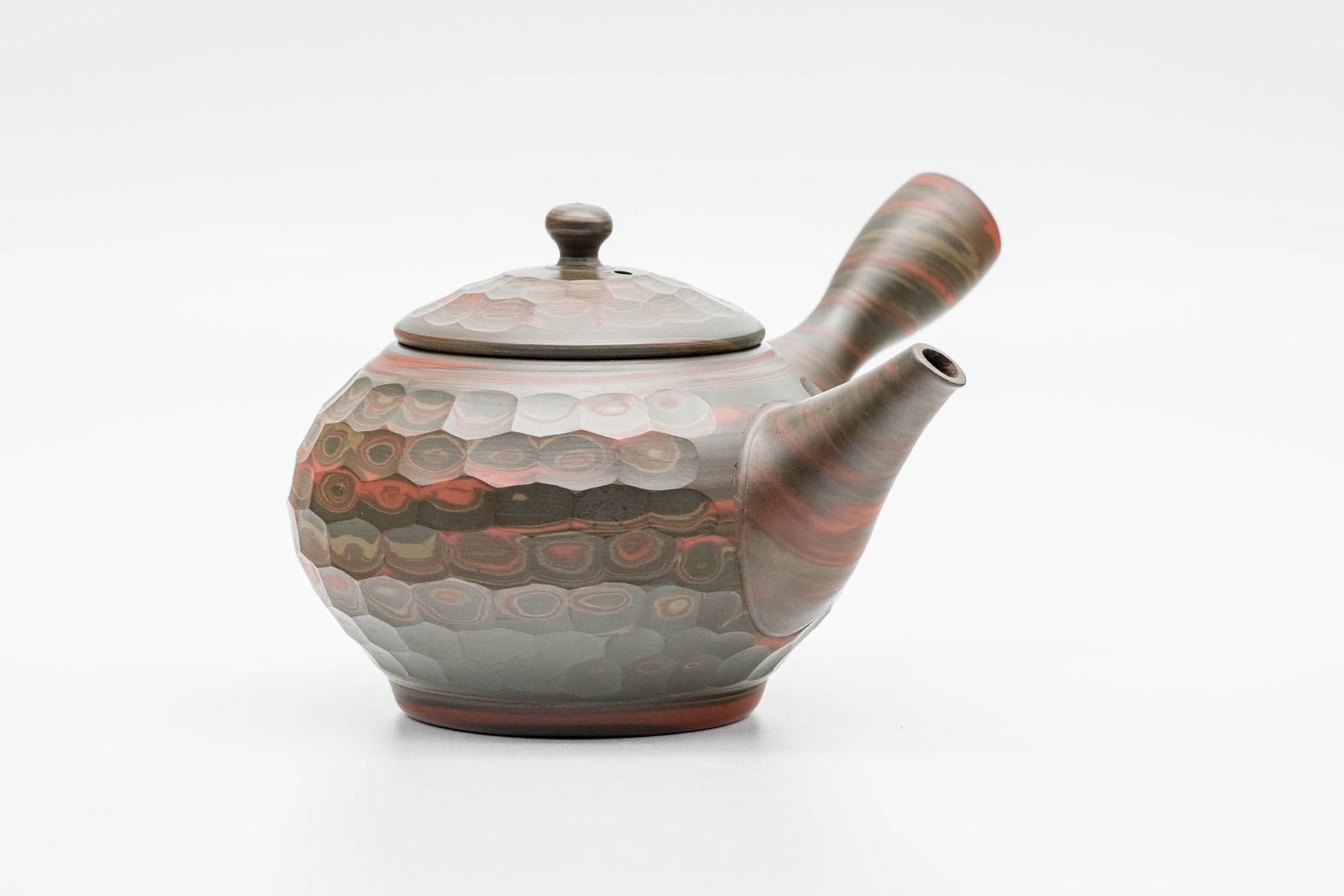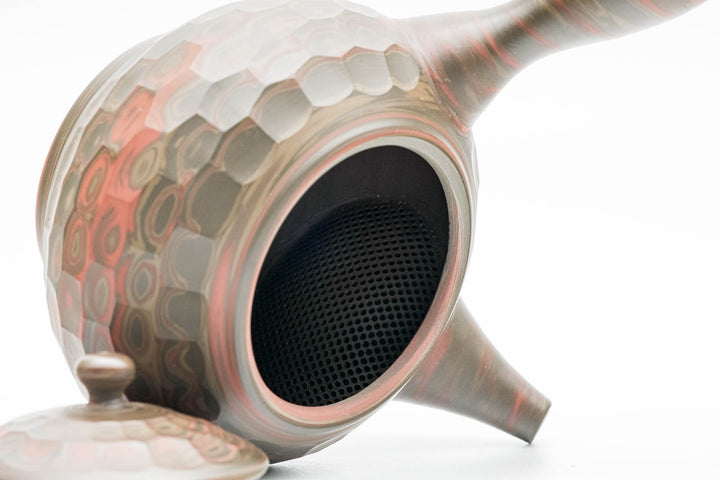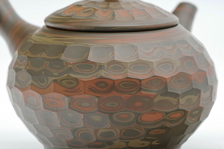 YusenThis marbled Tokoname-yaki kyusu (teapot) has a round shape and is made from red, brown, and green clay kneaded together in the nerikomi (練り込み) technique. The cuts made to create this pot's faceted shape reveal even more layers and patterns of marbling.