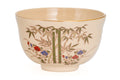 This Kyo-yaki chawan (matcha bowl) features a bamboo grove motif with gilded lines and a golden lip. The bowl is made in the classic Ninsei (仁清) shape, with a slight waist or tightening of the torso, accompanied with a slightly inward facing lip.