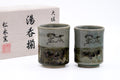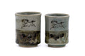 This Obori Soma-yaki meoto yunomi pair (large and small couple's teacups) is made in the famous double-walled style and decorated with a crazed celadon glaze accented with hand-painted horse motifs and cherry blossom-shaped cutouts.