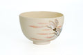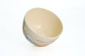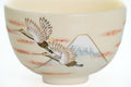 Eyuki KilnThis classy Kiyomizu-yaki chawan (matcha bowl) is made in the classic wan-nari shape and features an ivory glaze decorated with a fujigunkaku (富士群鶴) motif. This traditional subject of a flock of cranes flying over Mt. Fuji combines two classically auspicious symbols.