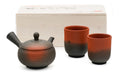 Iwase KōjiThis expertly crafted Tokoname-yaki tea set consists of a kyusu (teapot) and a meoto yunomi pair (large and small couple's teacups). Each piece is made from the iconic Tokoname shudei (朱泥) clay, fired with a striking yōhen (窯変) gradient from a rich vermillion red to a deep coal black. The teapot's built-in ceramic debeso filter is perfect for naturally straining tea.