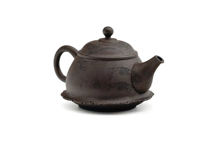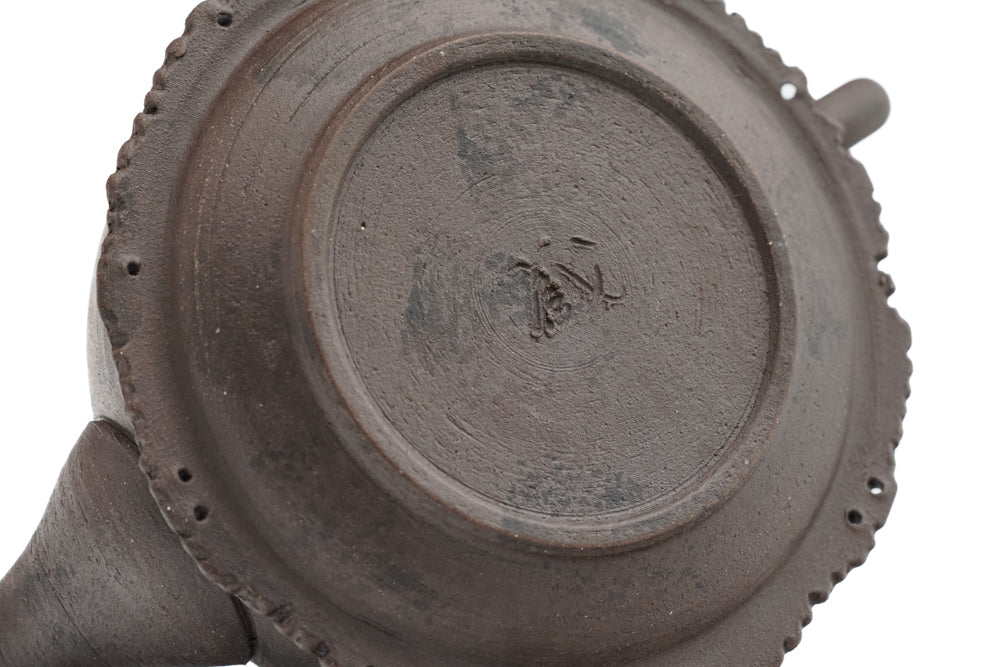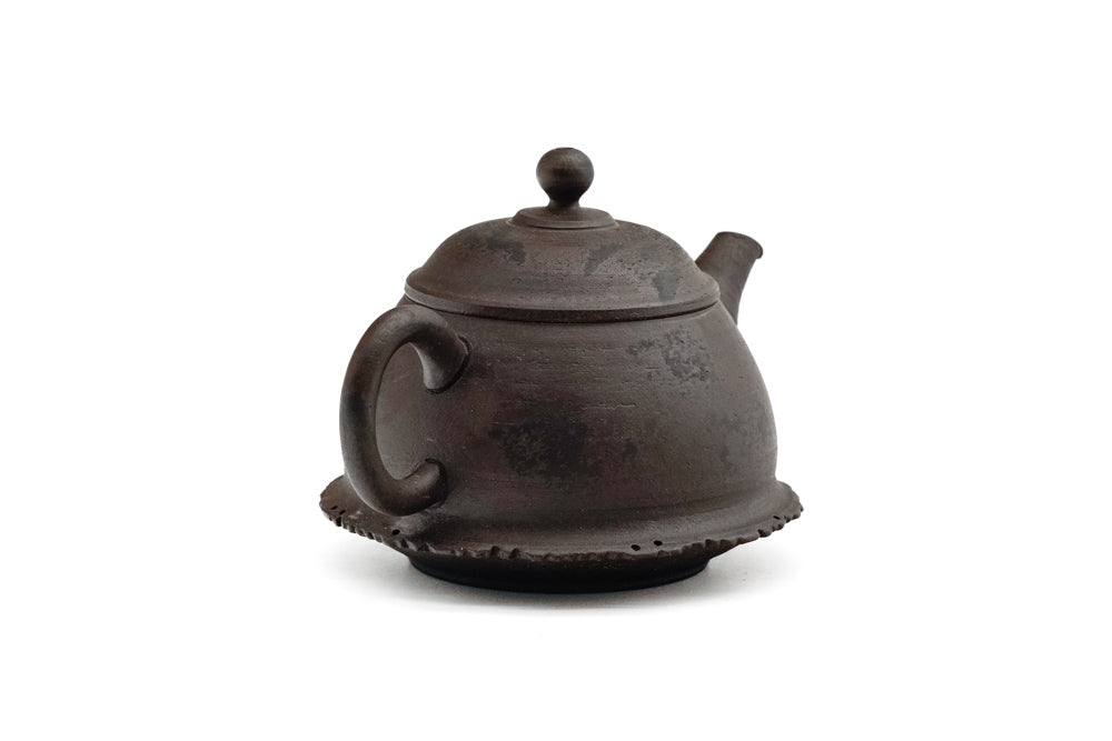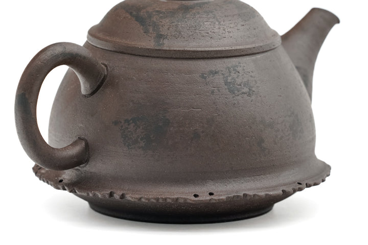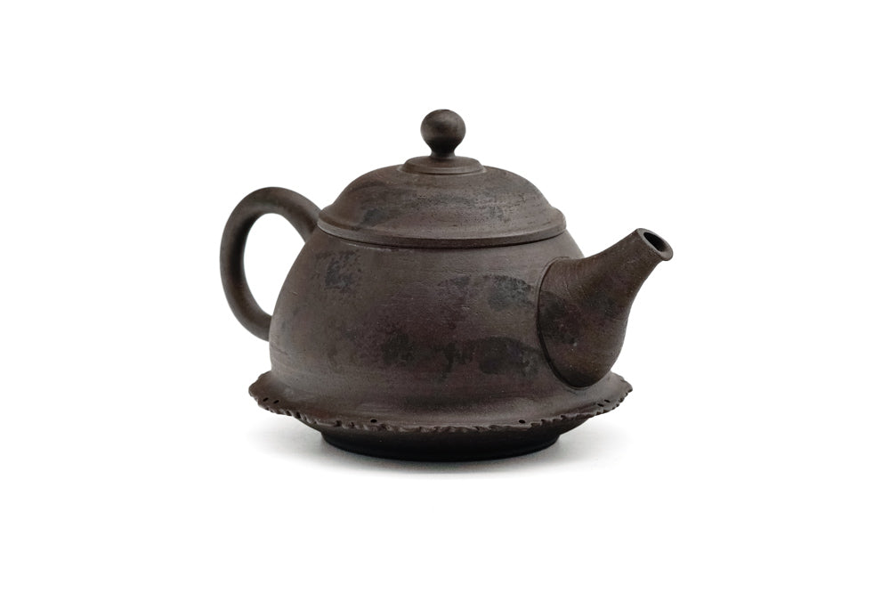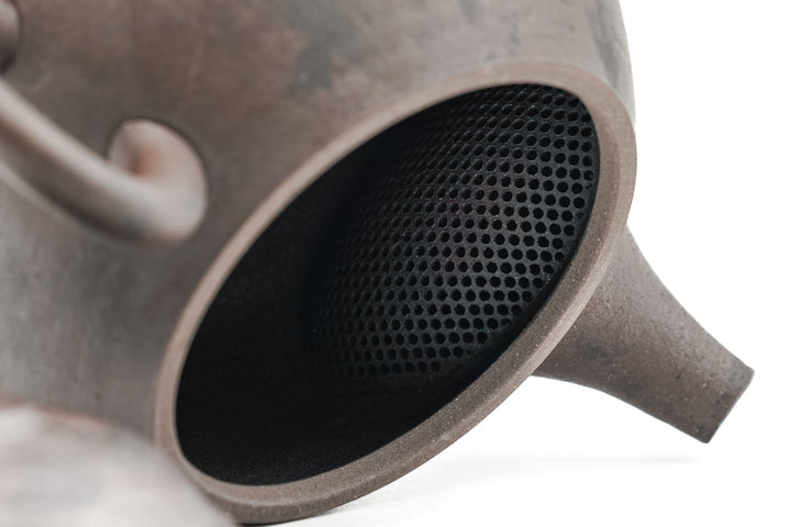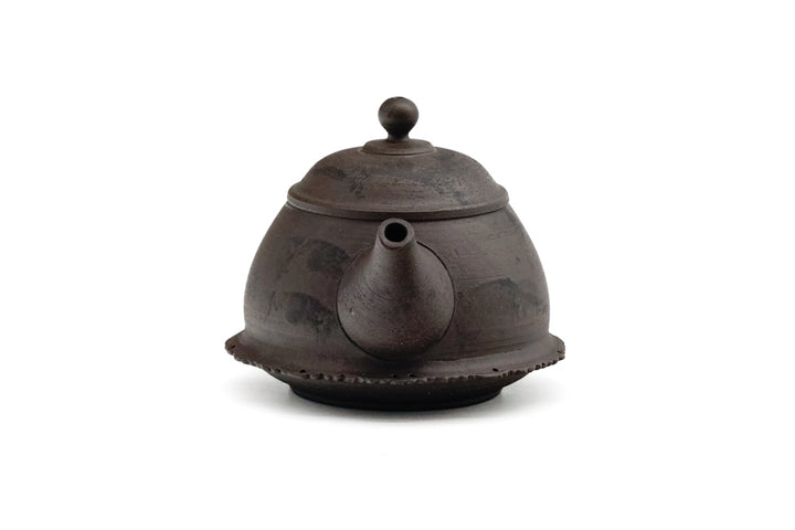 This unique and rustic rear-handled kyusu (teapot) is made in the style of an old cast-iron kettle or tetsubin. The matte brown clay has a mottled appearance, mimicking the look of old rusted iron. To achieve this effect, Junzō-san made this clay himself from clay dug up from his workshop's basement. To further mimic an iron pot, Junzō-san replicated the look of a weathered and rusted 'wing' (羽 - hane, the flange where the pot rests on a stove)