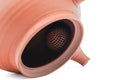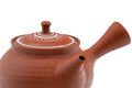 The surface is unpolished and unsmoothed, in a style called sujihiki (筋引) which is a subtler variation of rokurome (ろくろ目 - potters' wheel marks) which shows the flow of the potter's fingers as they shaped the piece on the wheel. The lid is decorated with a simple hand-painted pattern. The teapot's built-in ceramic debeso filter is perfect for naturally straining tea.