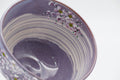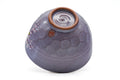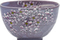Murakami IkuThis elegant Kyo-yaki chawan (matcha bowl) has a fun spin on a classic shape with a subtly flattened front and faceted bottom. Atop the red clay, this chawan has a soft purple glaze, decorated with hand-painted shidarezakura (枝垂れ桜 - weeping cherry blossoms) on the face and on the inside. The inside is further decorated with a brushstroke of white slip in the Korean hakeme (刷毛目) style