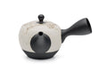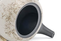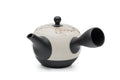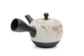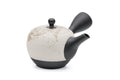 Shōhō KilnThis maru-gata Tokoname-yaki kyusu (teapot) is made from Tokoname kokudei (黒泥) clay and features a white glaze on the body, decorated with an intricate web of fine mogake (藻掛 - seaweed wrapping) patterns. As the name suggests, this traditional Tokoname technique that dates back to the Edo period is achieved by wrapping each piece with amamo seaweed before firing. In the kiln, the seaweed burns off, leaving its carbonised silhouette draped across pot.