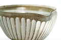 This spouted chawan (matcha bowl) features a wide, open shape for easy whisking and inward-sweeping walls that prevent matcha from splashing over the sides. The outside is decorated with a fluted pattern called shinogi (しのぎ) filled with white slip.