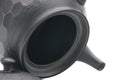 The body is decorated with a detailed pine bark textured that contrasts with the smooth spout and handle. Made using a small wheel, this texturing technique is called matsugawa (松皮 - pine bark) in Japanese. It is further decorated by cuts made in the surface which produce a scale like pattern. This cuts are accentuated in the shudashi (朱出し) style, in which a thin layer of the blackened clay is scraped off, revealing the brilliant vermillion of the shudei clay underneath.