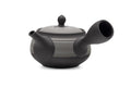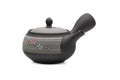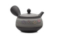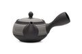 Shunju KilnThis Tokoname-yaki kyusu (teapot) is made from a black clay, decorated with stripes of grey and white with floral motifs.