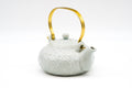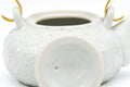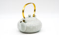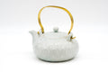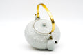 This elegant Kiyomizu-yaki porcelain dobin (top-handle teapot) is made in a classic shape and is hand-decorated with the auspicious shippo (七宝) crest using the icchin (イッチン) technique. Icchin involves loading slip (liquid clay) into a piping bag, and trailing it onto the pot to create designs with dimension. On this piece, each shippo-mon is further accented by alternating dots of silver and gold at their centre. The elegantly curved top handle is made from brass which matches these gold dots.