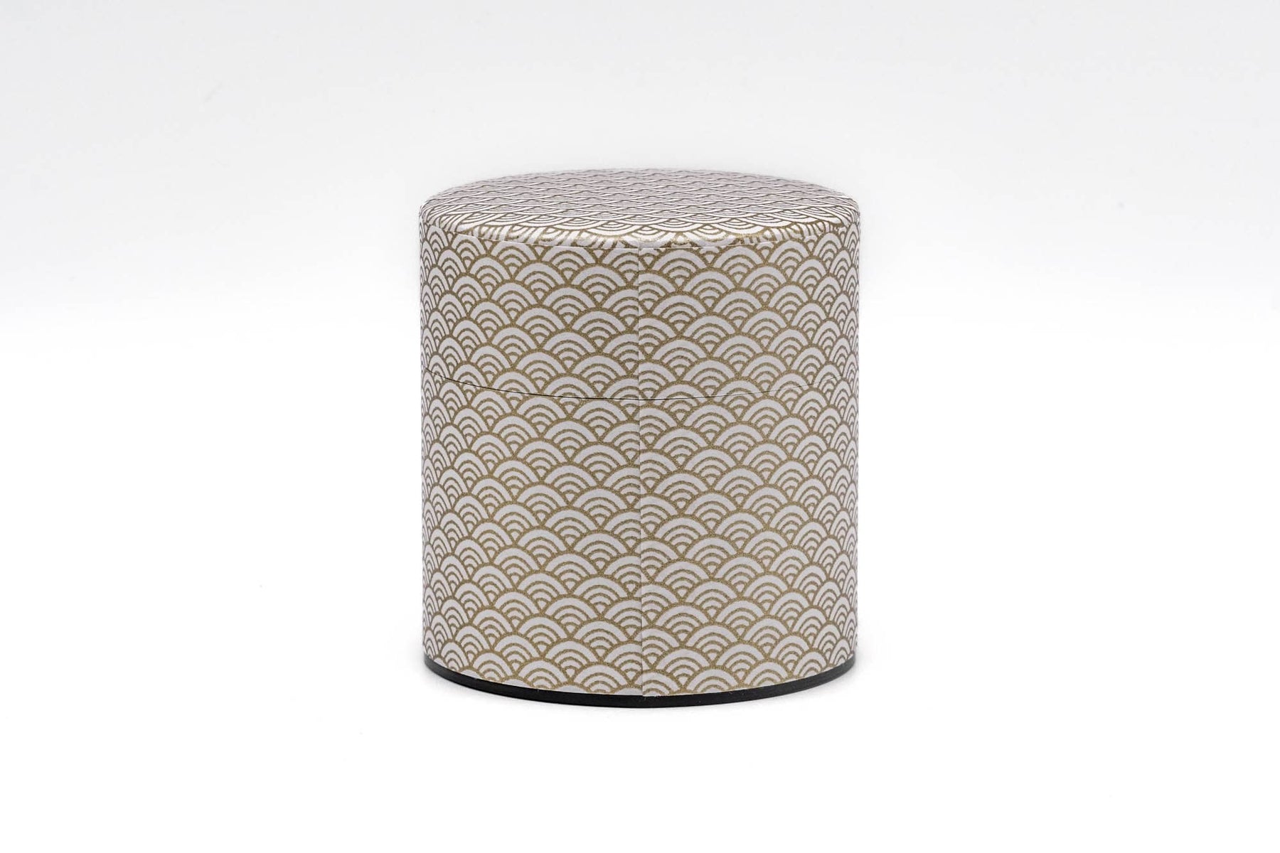 This chazutsu (tea canister) is made from tin-plated steel and wrapped with white washi paper decorated with the traditional Japanese pattern, seigaiha (青海波 - blue ocean waves) in gold.