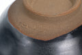 This slightly distorted Kuro-Oribe spouted chawan was designed and produced as a collaboration between Tezumi and Hiroshige Katō of Kasen Kiln. Each bowl was hand-thrown and then manually distorted into a delightfully playful gourd shape before being hand-painted with an iron underglaze design which combines geometric patterns with naturalistic scrollwork. After glazing and firing, each bowl was soaked for two days in a solution called tochishibu (栃渋) which is made from horse chestnut caps. The result is a staining effect which softens the white of the glaze, emphasizes the crazing and darkens the exposed clay.