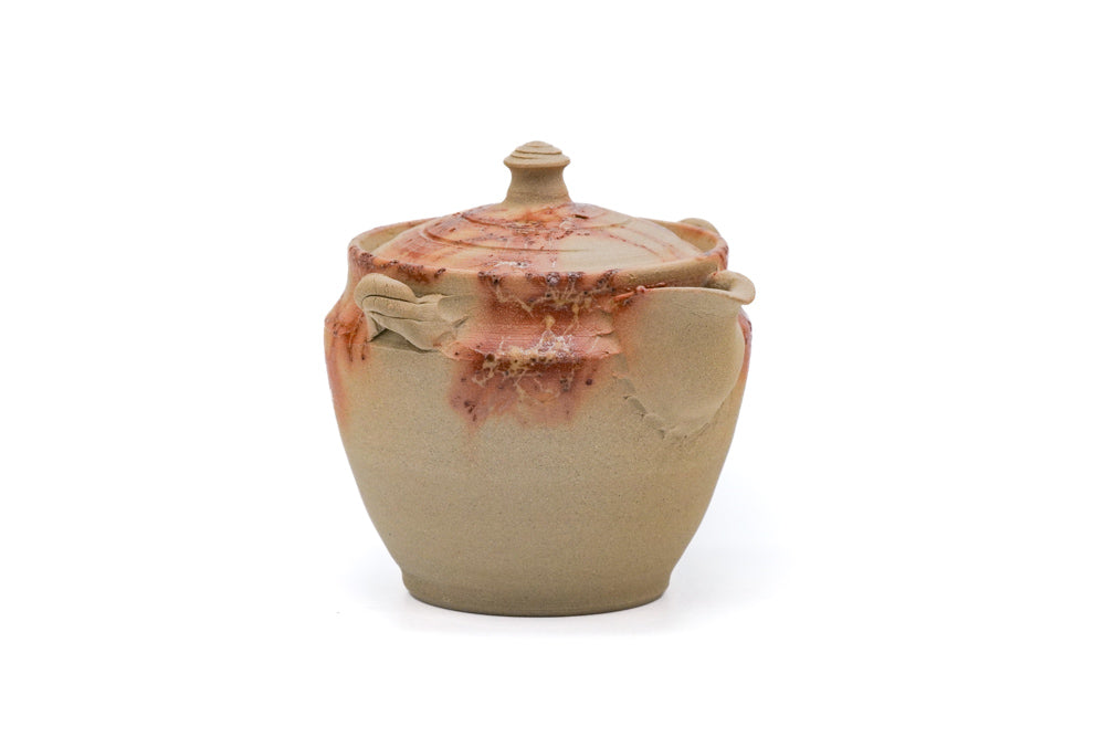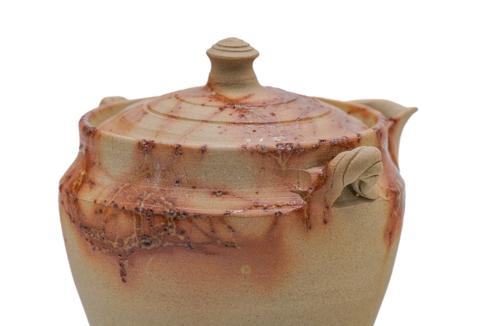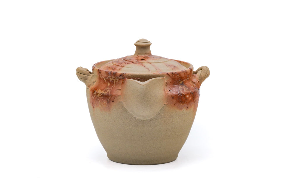 Tanikawa JinThis exquisitely crafted Tokoname-yaki houhin (handleless teapot) is made from a light brown clay, decorated with a hidasuki (緋襷) pattern. This traditional decoration is created when the potter wraps rice straw around a piece before placing it into the kiln, where the alkalines in the straw react with iron in the clay body to produce these striking scarlet burn marks. Due to the organic nature of this process, each piece will be different.