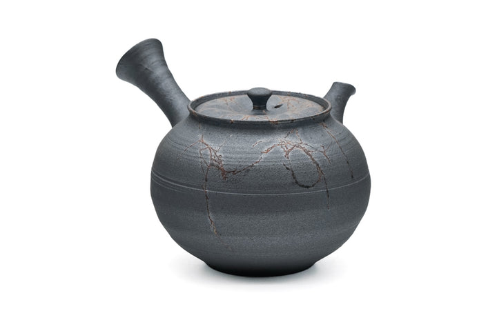 Fujita TokutaThis unique Tokoname-yaki kyusu (teapot) has a round, all-purpose shape, and is made from a dark grey clay decorated with an intricate web of fine mogake (藻掛 - seaweed wrapping) patterns. As the name suggests, this traditional Tokoname technique that dates back to the Edo period is achieved by wrapping each piece with amamo seaweed before firing. In the kiln, the seaweed burns off, leaving its carbonised silhouette draped across pot.