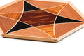 TomiokaThis stunning hexagonal wooden tray features a pattern of two overlayed concave triangles, with each panel being made of different types of wood, with cherry bark at the centre. The panels are outlined using the raden (螺鈿) technique of mother-of-pearl inlay.