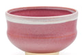Rinzan KilnThis Kiyomizu-yaki chawan (matcha bowl) is made in the classic waisted dojimari-gata shape and features a bright pink glaze, decorated with a ring of white glaze around the lip. The wide, half-cylindrical shape is great for beginners to whisk in, and the slight waist makes it comfortable to hold in the hands