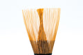 After use, be sure to clean your chasen by whisking it in a bowl of water or running it under the tap, using your fingers or a cloth to remove any matcha that has stuck to the tines. Avoid soaps as these can damage the porous bamboo. Stand the whisk up and let it air dry thoroughly. This will ensure that the tines keep their shape longer and prevents mold growth. To further reshape the tines, you can use a kusenaoshi, or matcha whisk shaper.