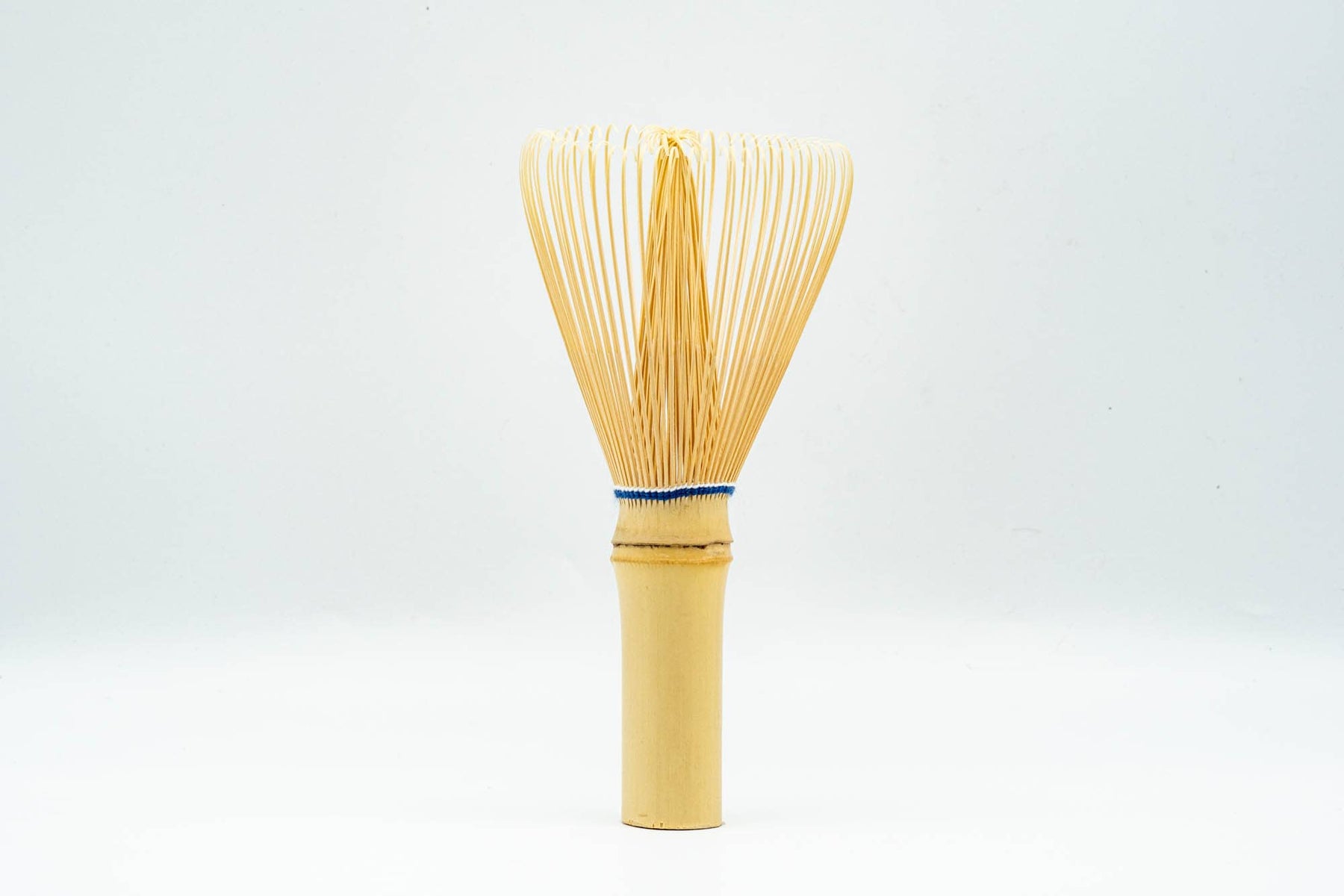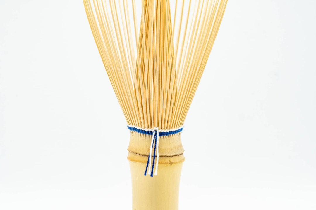 SuikaenThis long-handled shiratake white bamboo chasen (matcha whisk) is a unique design from Suikaen. Featuring the same number and shape of tines as a standard kazuho, this whisk (called a "Bubble point chasen" - 泡点つ茶筌) has a longer handle, aiding in the quick formation of foam. Its tines are tied with an elegant combination of blue and light blue thread.