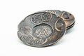 This set of four heavy metal chataku (tea saucers) feature a bronze finish decorated with geometric emblematic designs and kanji.