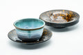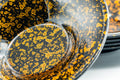 This set of five elegant chataku (tea saucers) are made from wood coated with traditional urushi lacquer, and is decorated with the traditional Japanese pattern 'kara-nuri' (唐塗/unique coating) in black and gold.