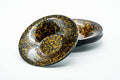 This process repeats many times until the pattern is built up. Each product coated with this lacquer is a one-of-a-kind item due to the intricate and time-consuming nature of the craft. This process can be seen in action here: https://youtu.be/HxWFF_n0ikQ?t=1036