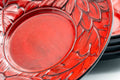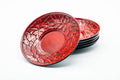This set of five lacquered chataku (tea saucers) are carved with beautiful floral decorations.