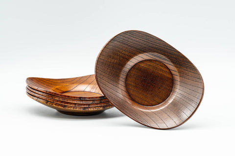This set of five wooden chataku (tea saucers) feature an oval shape with an elevated rim.