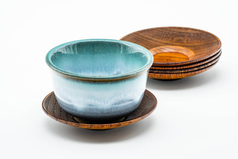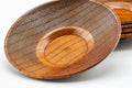 This set of five lightweight wooden chataku (tea saucers) feature a spiraling woodgrain texture and an elevated rim.Dimensions:9cm (3.5in) - width1.5cm (0.6in) - heightCondition: Very goodThis vintage Japanese item ships from Thailand