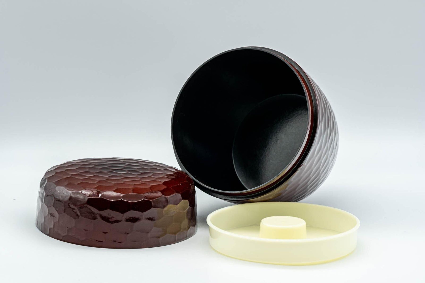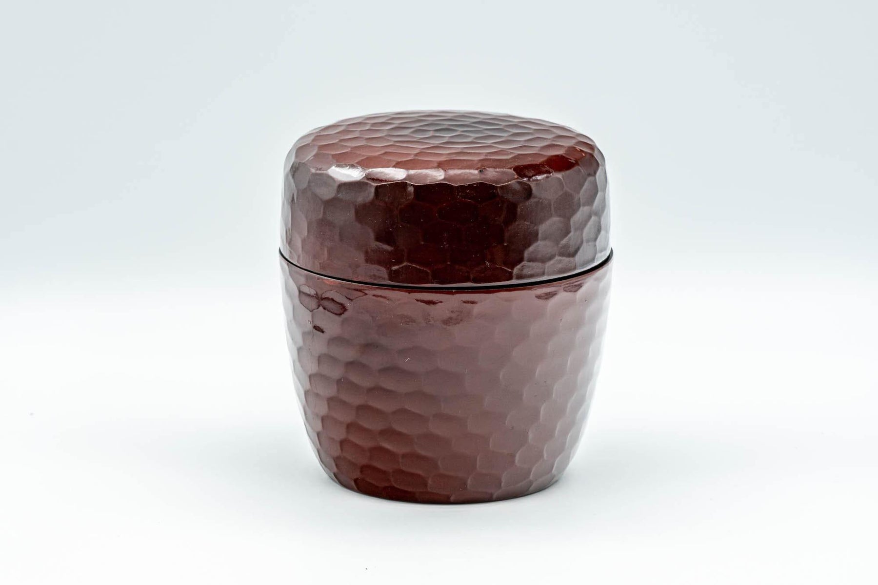 This burgundy/red laquer chazutsu (tea caddy/canister) features a faceted exterior.