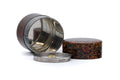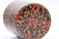 This multicoloured chazutsu (tea caddy/canister) is made from metal coated with traditional urushi lacquer, and is decorated with the traditional Japanese pattern 'kara-nuri' (唐塗/unique coating).
