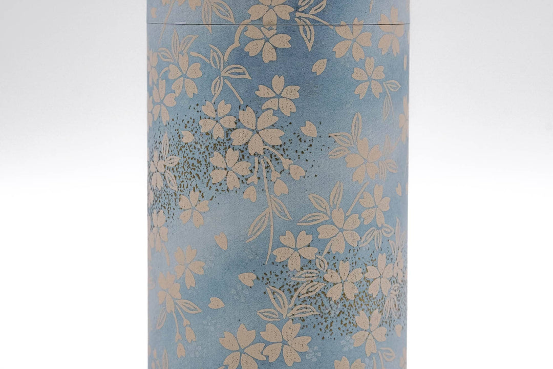 KotodoThis tall chazutsu (tea canister) is made from tin-plated steel and wrapped with light blue washi paper decorated with beige-gold cherry blossoms.