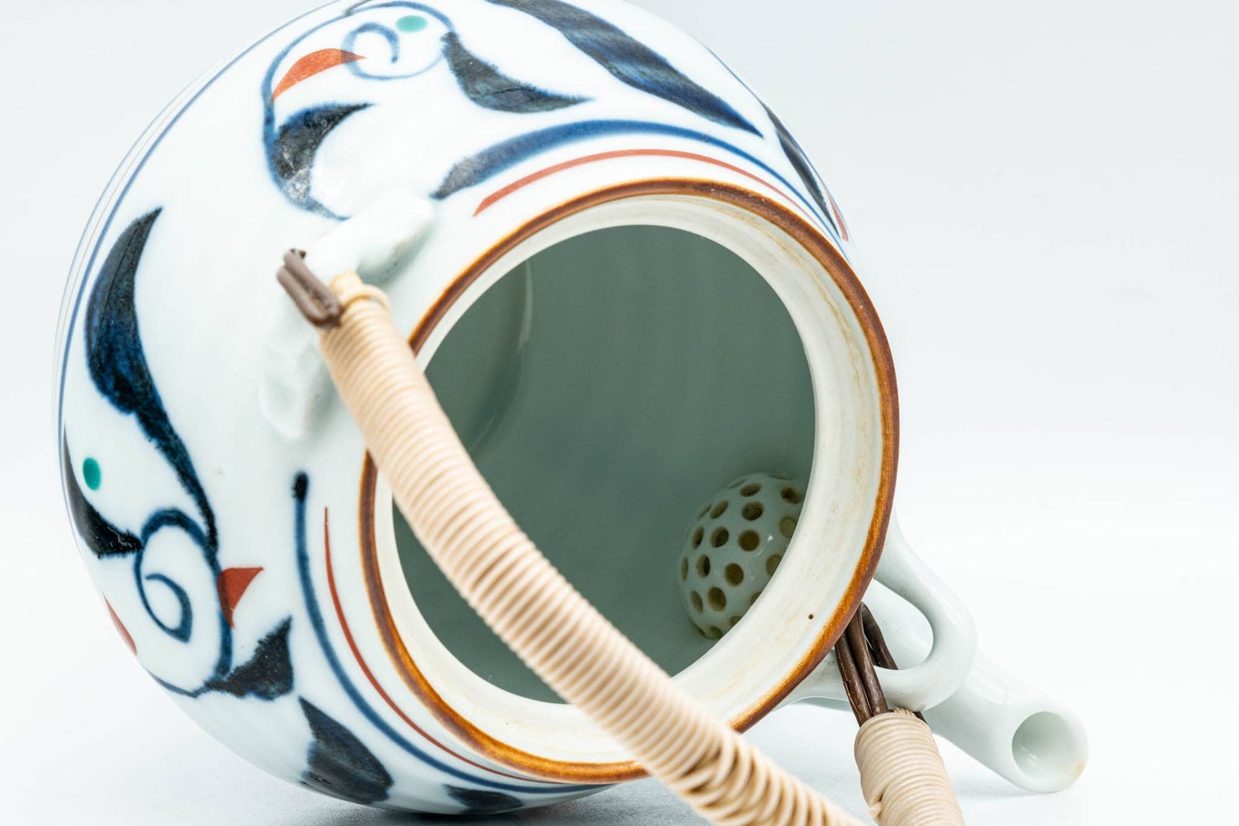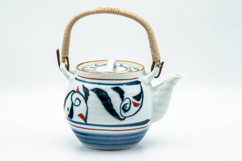 This Arita-yaki dobin (top-handled teapot) features blue and red geometric patterns