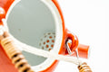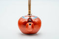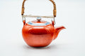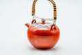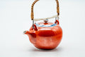 This small Arita-yaki dobin (top-handled teapot) features a glossy red glaze decorated with blue geometric trim around its lid. Its built-in ceramic debeso filter is perfect for naturally straining tea.
