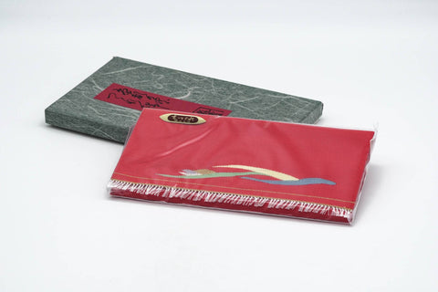 This fukusa-basami (袱紗挟み - cloth wallet) is hand-woven from red silk with a simple motif, made in the traditional Japanese tapestry weaving technique called tsuzure-ori (つづれ織). This smaller size is designed for women.