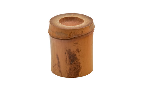 A futaoki (蓋置 - lid rest) is a small stand used to hold the lid of the kama or for resting the hishaku on. They are typically made of bamboo, ceramic, or metal, and come in a vast array of shapes and styles. While metal and ceramic futaoki can be quite ornate and are considered more formal, the common and basic bamboo types are largely undecorated and are the least formal style.