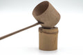 In a tea ceremony, a futaoki is used both as a rest for the bamboo ladle (hishaku) and for lid of the kama (kettle), which is where it gets its name. This futaoki is shaped for use during the Ro season (roughly winter through spring).